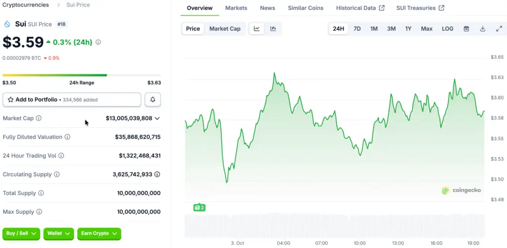 Sui is presently trading within the range of $3.25 to $3.59, establishing an important support level as traders keenly observe for potential bullish momentum. This price zone has emerged as crucial, offering structure and confluence that may facilitate a rally toward the $4 target.