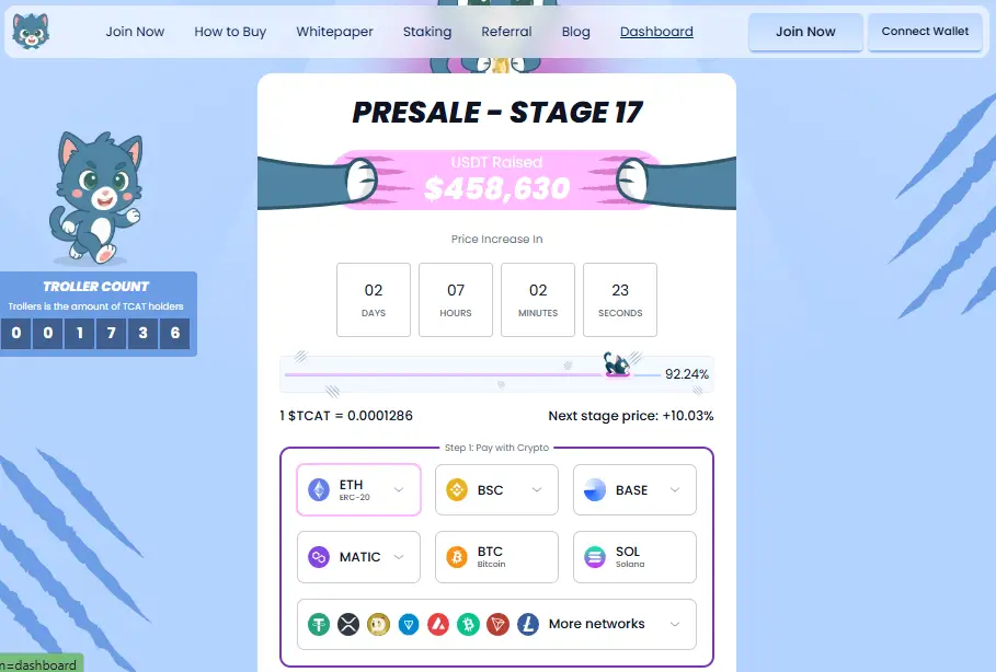 The market has responded with enthusiasm to Troller Cat’s unique approach. The project has already raised over $450,000 and has attracted more than 1,700 holders. This rapid growth is a testament to the project’s ability to blend humour and storytelling with genuine investor appeal. Early buyers have seen an impressive ROI of over 2,471% since the first-stage price of $0.00000500.