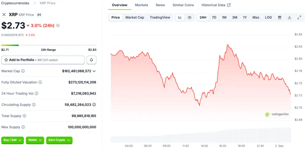 The Moving Average Convergence Divergence for XRP also suggests a possible bearish crossover. This could happen in September, which could cause the price to drop to $2.17. A lot of people can see the technical signals very clearly.