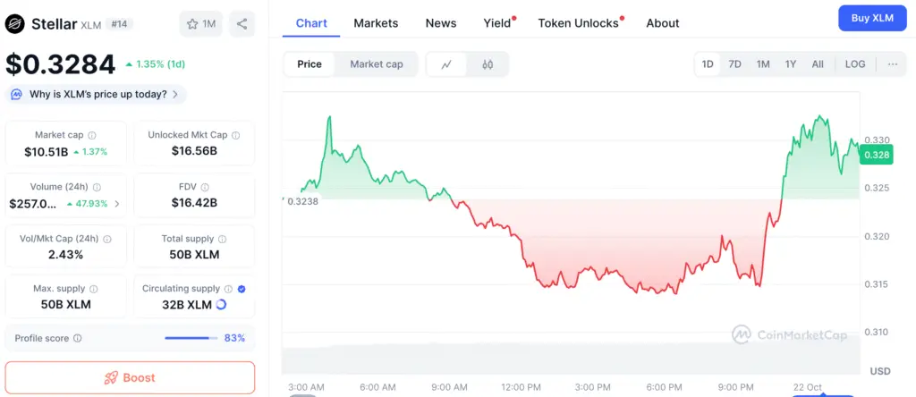 Stellar (XLM) has come back as one of the best-performing cryptocurrencies in late October because more and more people are using it for worldwide payments. The cryptocurrency, which was created to make cross-border payments easier, is trading around $0.326. It looks like it is starting to rise again after months of staying the same.